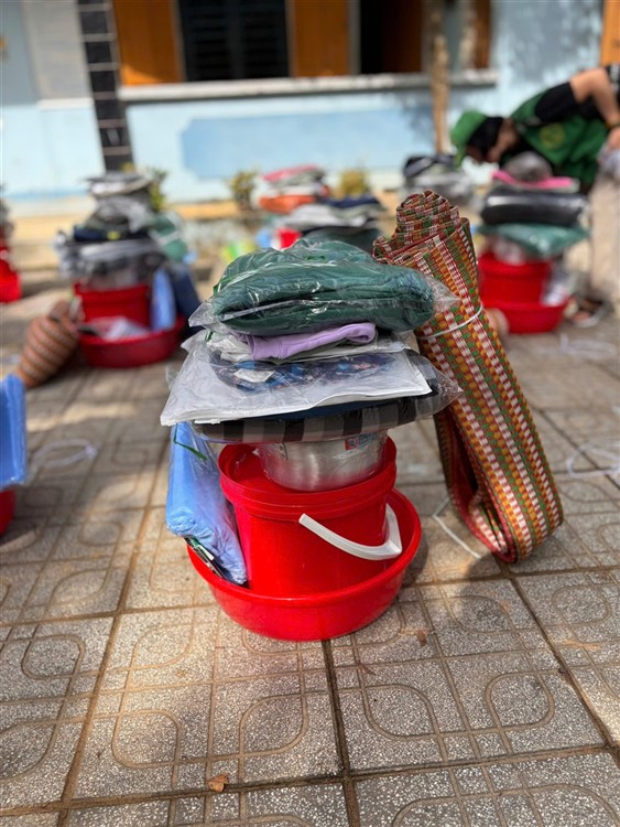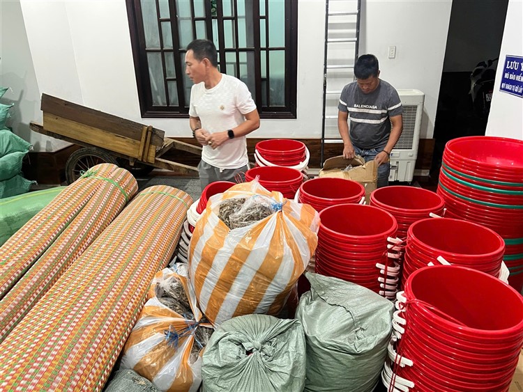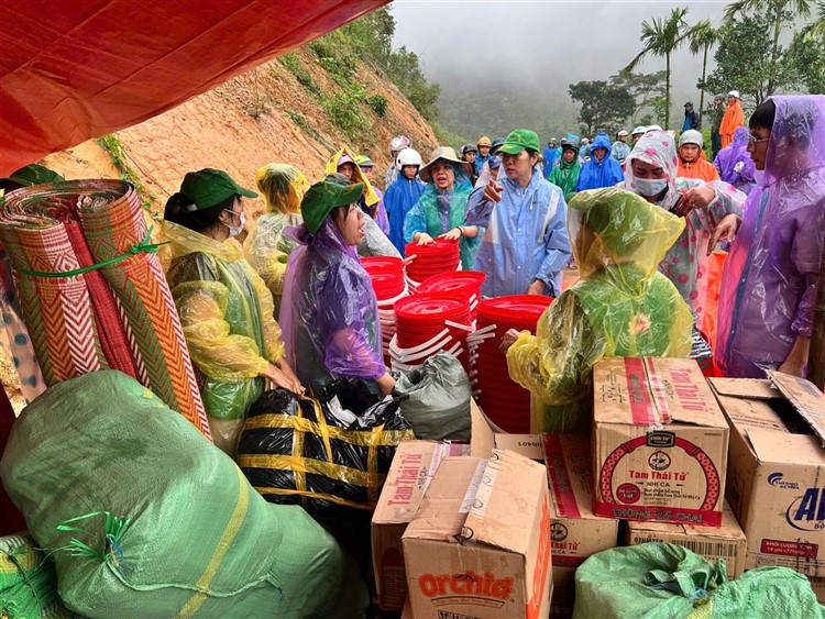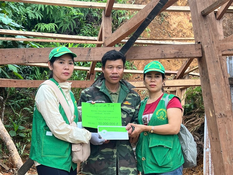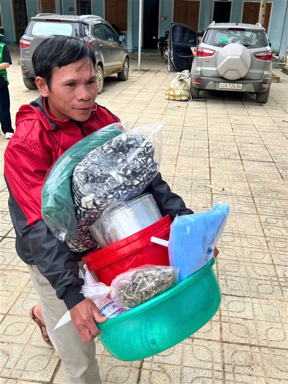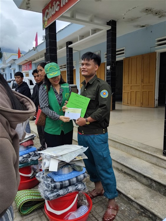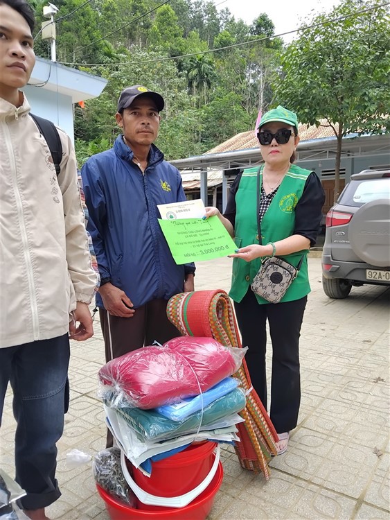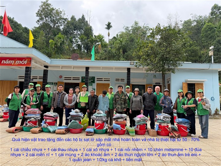 Sau đó đoàn đã triển khai phần quà , tiến hành trao quà hiện vật gồm : chiếu nhựa lớn (1) , thau nhựa (1), xô nhựa (1), nồi nhôm (1), chén (chục) đủa nhựa (chục), mền nĩ (2) , mùng (1), áo khoác ấm (mới 2) , áo thun (mới 4) , 1/2kg cá khô … kèm tiền mặt hỗ trợ là 10 triệu đồng (mỗi hộ) đến những hộ nhà bị lũ quét sập mất nhà hoàn toàn mà đoàn không thể đến được tận nơi .
