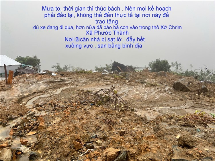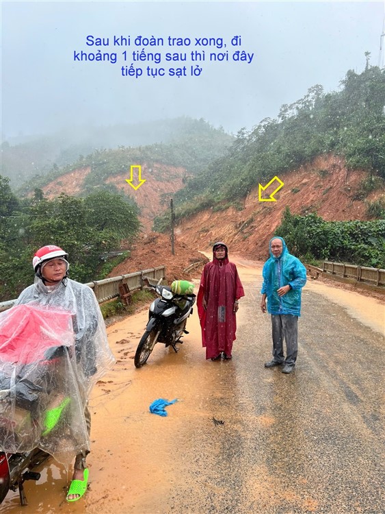 Thật vậy , thật may mắn , trên đường ra chúng ta cũng đã dừng lại để đến trao suất hỗ trợ nhà bị quét sập bình tại xã Phước Chánh , khi trao xong đoàn vừa đi khỏi thì đất đá trên 2 núi đồi ngay đó tiếp tục sạt lở … Trong cái mai có cái rủi , trong cái rủi có cái mai : 1 xe của Quảng Nam bị kẹt lại , nhờ vậy mấy tiếng sau mới đón được 4 người của đoàn bị hỏng xe dọc đường (4 người buộc phải đi về chuyến bay của ngày hôm sau)