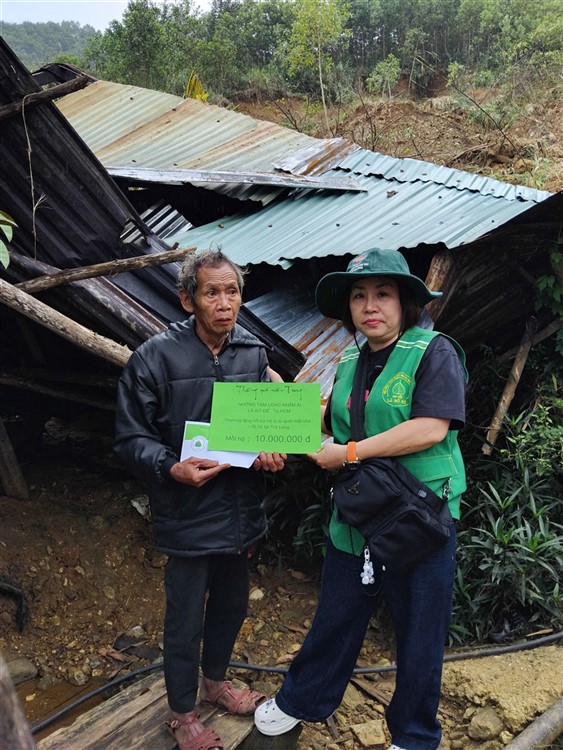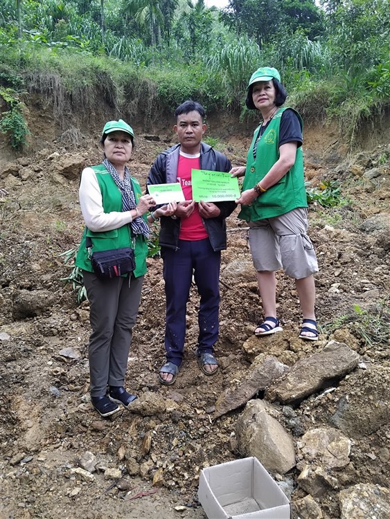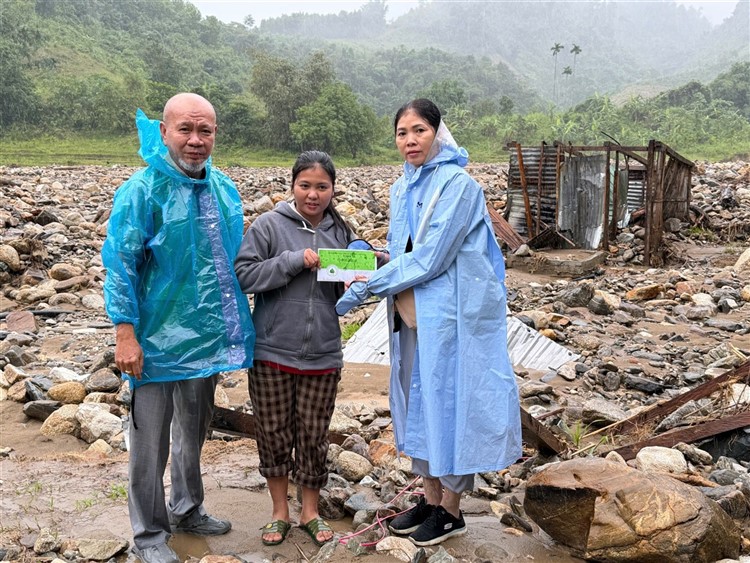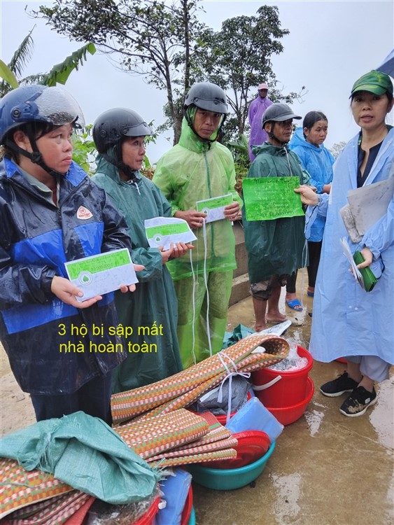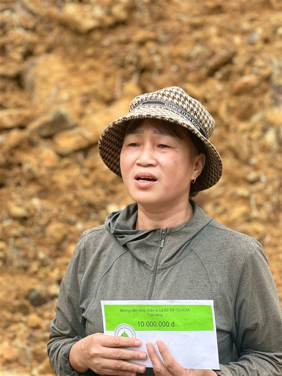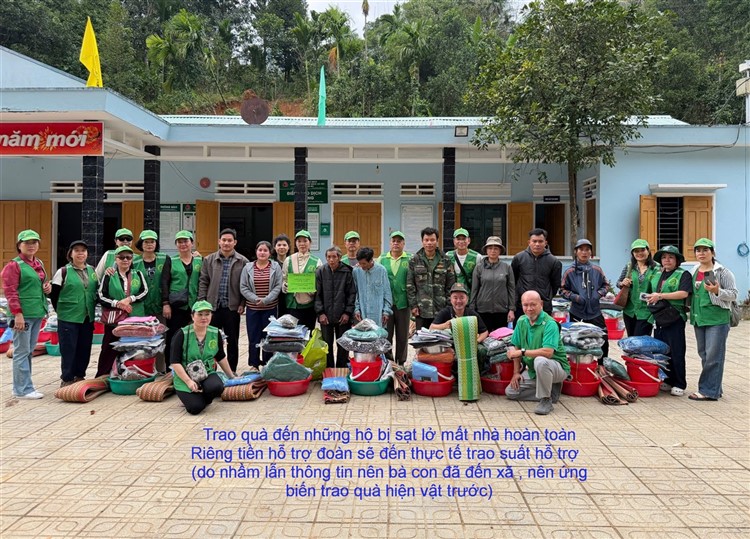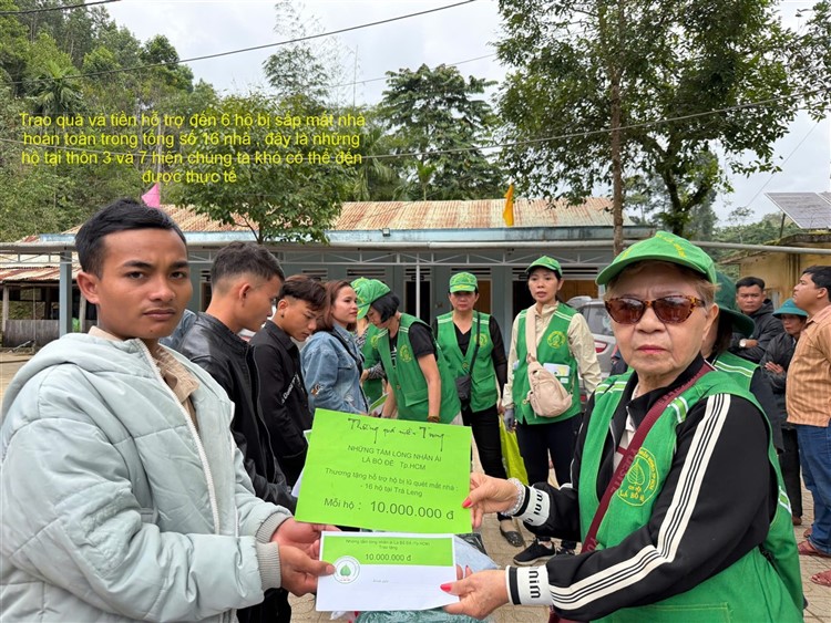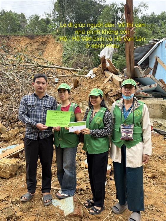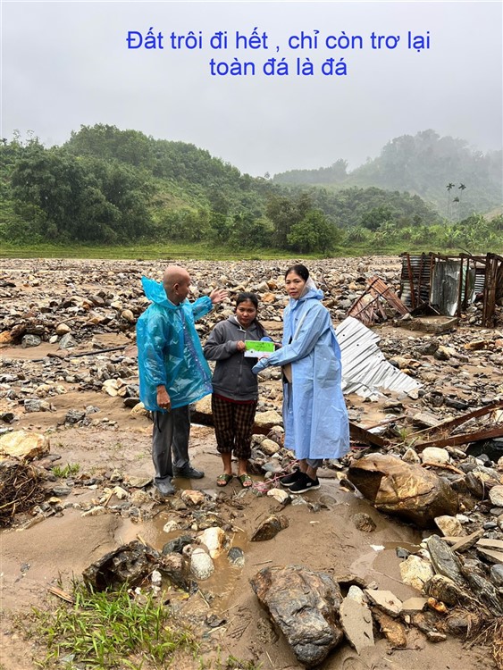 Sau đó đoàn chia thành 2 toán đi đến tận nơi trao tiền hộ trợ 10 triệu đồng (mổi hộ) . Thật đau lòng khi chứng kiến những thảm cảnh đau thương trước những đống đổ nát của những căn nhà bị sạt lở, có nhà thì không còn gì hiện diện trên mặt đất … Những lời an ủi động viên là không thể thiếu mà các thành viên đã không quên mang đến với bà con , một nghĩa cử nhỏ cũng là liều thuốc chữa lành giúp bà con vượt qua sang chấn tâm lý sau khi đối diện giữa làn ranh sanh tử .