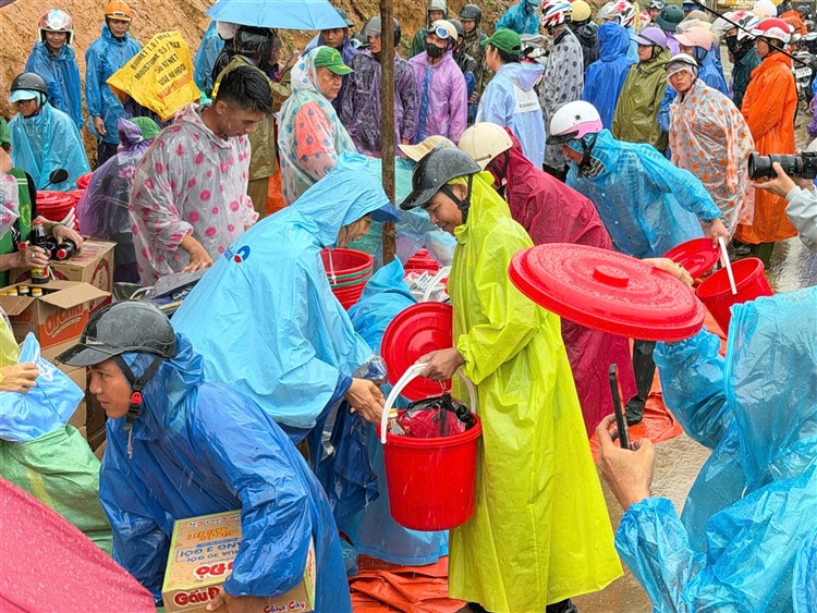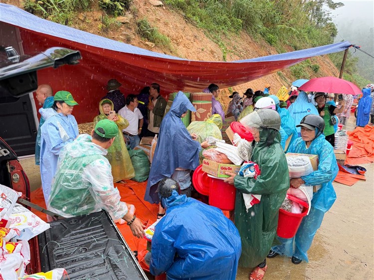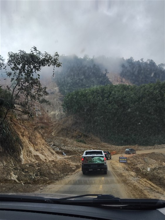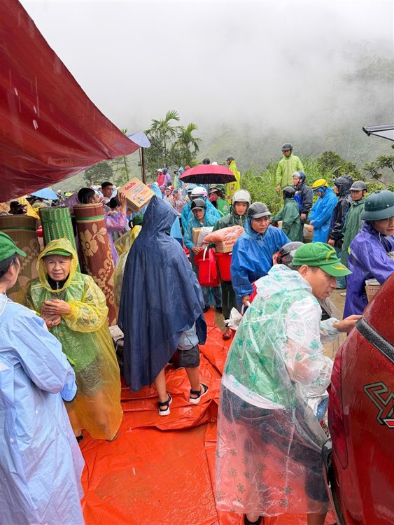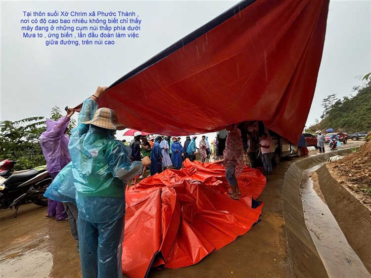 Không biết độ cao ở đây là bao nhiêu , chỉ thấy có những ngọn núi và mây vẫn đang còn thấp hơn chỗ chúng ta . Bà con là những cư dân cư ngụ bên kia dốc núi nơi ta đang trao tặng quà vì hiện vẫn còn những điểm sạt lở vẫn chưa được khơi thông hoàn toàn . Đây là những phần quà phần lương thực và nhu yếu phẩm do Xã đề nghị chúng ta đến hỗ trợ giúp bà con bên trong vùng còn bị cách trở vì sạt lở .