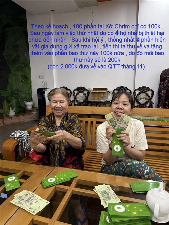 Cũng có sự nhầm lẫn nên địa phương cũng thông báo tất cả các trường hợp cũng tập trung tại đây để nhận quà…Chúng ta cũng đã trao quà và tiền hỗ trợ đến 8 trường hợp bị mất nhà và nhà bị thiệt hại (trong thực tế với điều kiện thời tiết và thời gian như hôm nay chúng ta không thể đến từng nơi như kế hoạch ban đầu mặc dù trên đường cũng có đi qua một nơi lũ quét bình địa 3 căn nhà)
